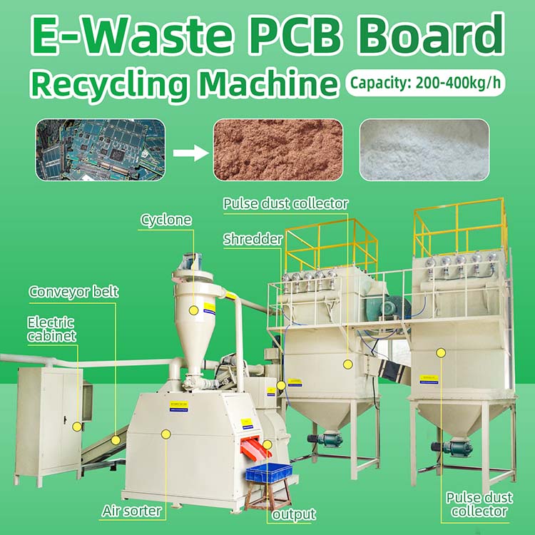 The equipment adopts dry crushing and pulverizing to make the waste circuit board into a mixture of metal and resin fiber powder, and then separates the metal from non-metals such as resin through a high-voltage electrostatic separator. The advantages of the equipment are low noise, no water, no dust pollution, power saving, manpower saving, no waste, and 99% of metals and non-metals are fully recycled. In order to prevent dust pollution during processing, the equipment adopts a three-in-one dust removal device. The dust removal device has three levels of dust removal: cyclone dust removal, bag dust removal and air purifier dust removal, which effectively solves the dust pollution problem. All indicators meet national standards.