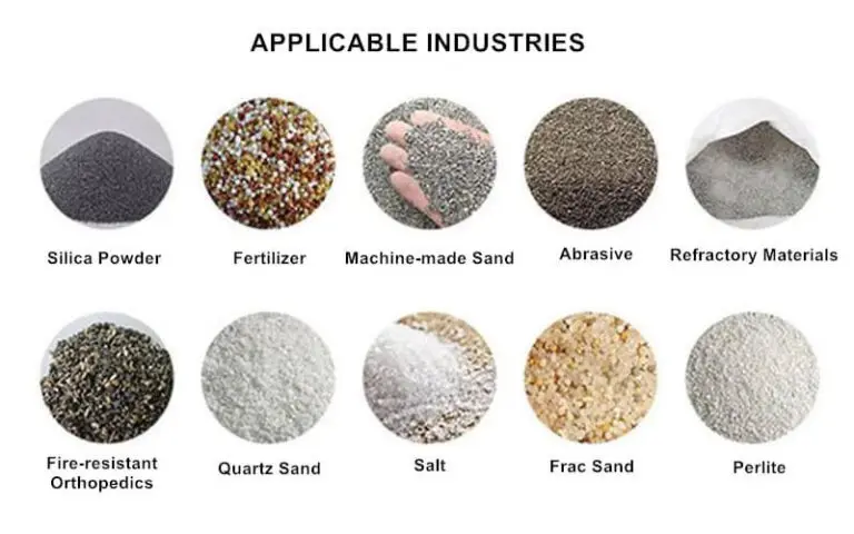 - Chemical: resin sand, pigment, washing powder, micro powder, paint, soda ash, lemon powder, rubber, and plastics.