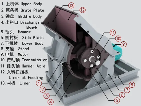 The main parts of a hammer crusher are the crushing chamber, rotor shaft, frame, impact hammer, grate bars, motor, flywheel, grate, pallets and lining, dust seal, and overload protection device.