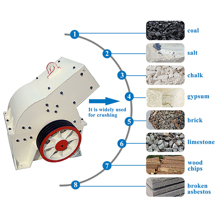 Material is fed into the hammer crusher, which is subject to rotation, high-speed impact, and collision. Qualified crushed ore is discharged through the grate, the larger size materials continue to be crushed and shattered until they reach the required size.