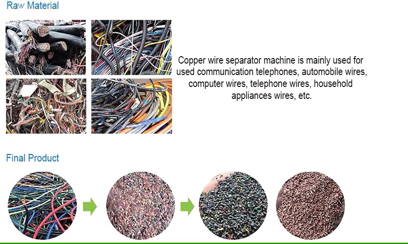phone wires,communication wires,electric cables etc. Copper recovery rate can exceed 99%.No any dust and water pollution during operation